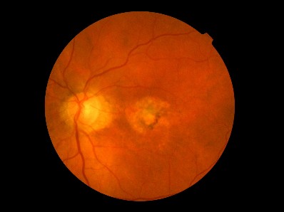 The center of the retina in this photo shows degeneration, which causes a debilitating blind spot in this patient’s vision. We can easily diagnose this and refer for appropriate treatment.